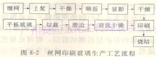 根據絲網印刷技術原理,把油墨印刷到平板玻璃的表面,而后采用油墨的固話措施,使得圖案固經久耐用。其工藝過程如圖8-2所示。