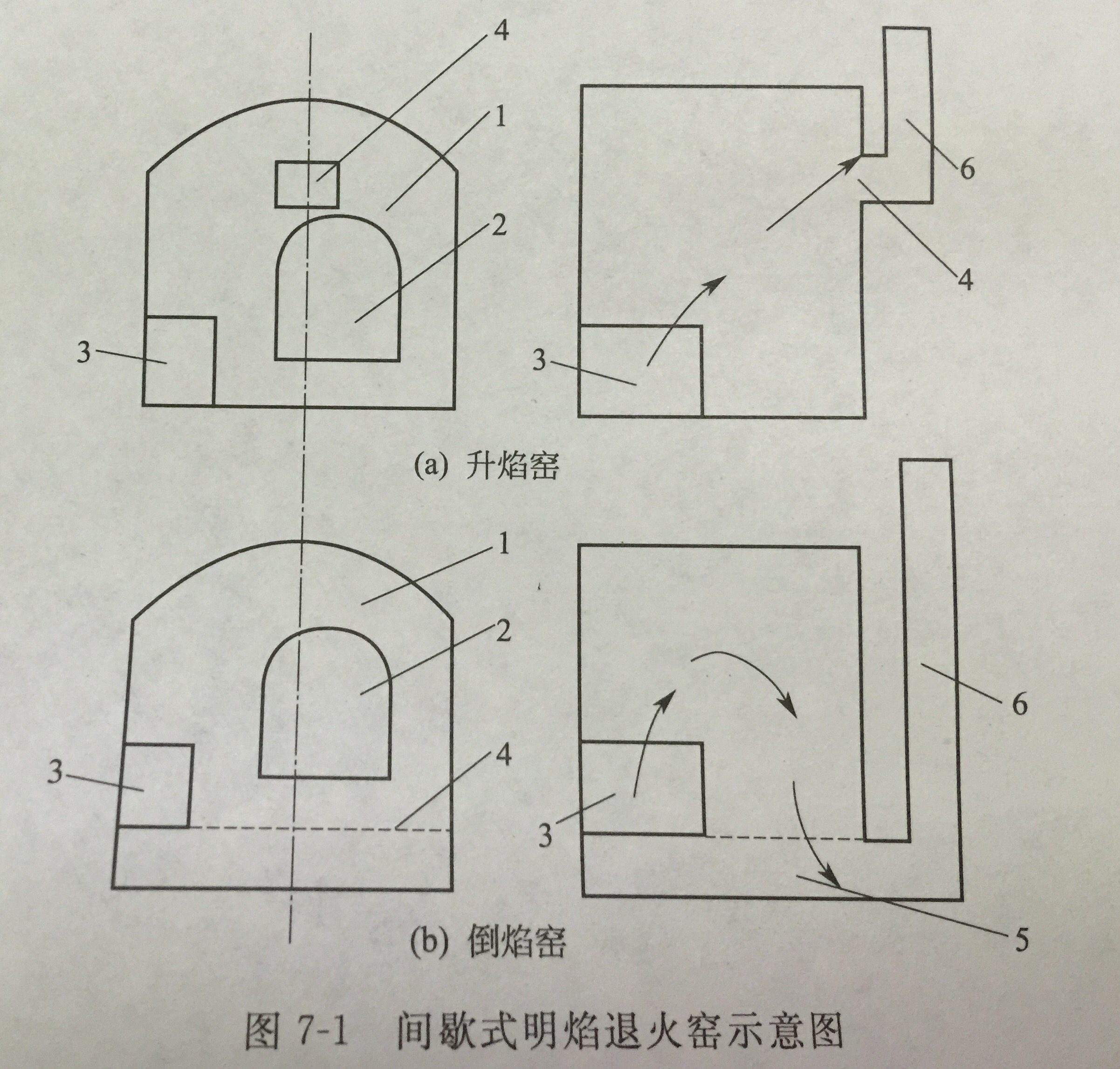 間歇式退火窯又分為明焰和隔焰兩種。在明焰退火窯中,制品可直接窯底上或放在小車內,一般用于手工成形、大型、厚壁和特種制品的退火。間歇式明焰退火窯示意如圖所示。隔焰退火窯一般用于光學玻璃的退火。