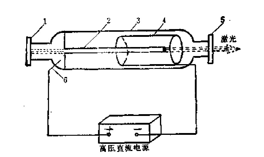 激光是60年代初出現的一種新穎光源。它的發光方式不同于普通光源。普通光源的發光是由于原子核周圍的電子從高能極向低能級遷時放出光子而發光。在一般情況下,原子核周圍的電子處于自然狀態——低能態(或稱基態),這時電子所處位置稱為低能級,物體并不發光。當原子受到外界影響(如加熱、放電、光照等)時,處于低能級的電子就跳到高能級,使原子處于高能狀態。電子在高能級是一種不穩定狀態,它要自發地向低能級躍遷,同時輻射出光子,使物體發光。這種發光狀態叫做自發輻射。普通的白熾燈、水銀燈等都屬于這種狀態。在普通的發光體里,處于高能態的原子數量較低能態的原子數量總是要少,因而它的發光能力總是不會很高。但對某些所謂激光物質,當它受到外界影響(如光照)時,大量處于低能級的電子跳到高能級,使處于高能態的原子數量較低能態的要多,即所謂“粒子數反轉”,這時如有適當能量的外來光子刺激(感應)處于高能狀態的原子,就會引起高能級上的電子向低能級躍遷,并發出和外來光子相同的光子,使物體發光。由于這種發光狀態是受外來刺激而輻射出來的,因此稱為受激輻射(激光)。輻射出來的光子為外來光子和電子躍遷時放出的光子,也就是說輻射出來的光要較外來光亮的多,這就是所謂光放大。激光器的英文名稱Laser即英文受激輻射放大的縮寫。當然,實際上激光器的工作不僅僅是上述一次放大,而是通過激光器內諧振腔的作用,反復進行放大、振蕩,然后輸出,因而有很大的亮度。下圖是常見的氦氖氣體激光器示意圖,放電管2用硬質玻璃或石英玻璃制成,內充氦氖氣體。儲氣套3使激光器有較長工作壽命。4為圓筒形陰極,6為陽極。1、5為反射鏡(構成諧振腔),其中一塊用于輸出激光的窗口、反射率為93.5~99%,另一塊要求反射率在99%以上。兩塊反射鏡的反射面要嚴格平行。當玻璃管內的兩個電極沒有接通時,氦氖氣體的原子處于基態,沒有光輻射。給兩個電極機上電壓,使氣體放電,產生光輻射。這時的光輻射還是屬于一般光輻射,光子的方向是雜亂無章的,其中有些逸出管外;有的垂直射到反射鏡表面。這些垂直射到反射鏡表面的光子被反射回去,成為“初始信號”,它們激發工作氣體的原子成高能態,再放出光子,然后再被反射鏡反射回去,再激發工作氣體放出光子,循環往復而使反射光不斷地被放大到一定程度后,其中一部分光線透過反射率稍低的那塊反射鏡射出,另一部分仍被反射回去,再激發工作物質而發射光子。當然,反射光的放大并不是無限的,它受各種因素的影響而到一定程度就不能再增大。但較普通光源來說,由于多次的光放大而變得非常強。
