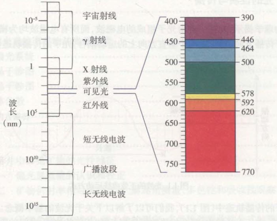 對于普通光學而言,“光”被定義為眼鏡可以直接看見的一部分電磁波的輻射,因此這一部分電磁波稱為可見光。如圖所示,在真空介質中可見光具有一定的波長范圍,大致為390nm~770nm,僅占整個電磁波譜的一小區段。可見光譜中不同頻率(3.9*1014Hz~7.7*1014Hz)的光在人的視網膜上的反應是不同的,表現為不同的顏色。因此,把一定頻率范圍內呈現同種顏色的光稱為單色光。在真空介質中,頻率不同的各種單色光具有不同的波長范圍,依照波長由長短的次序,分別為紅、橙、黃、綠、藍、紫七種顏色。通常所見的“白光”是由各種單色光按一定比例的混合光。